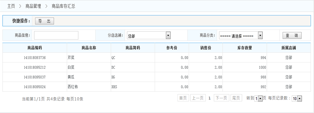商品庫存匯總: 導(dǎo)出:可以將列表中的數(shù)據(jù)導(dǎo)出到Excel表格 篩選:可以根據(jù)編碼或者簡碼或者名稱 快速找到某個商品 也可以根據(jù)店鋪或者商品分類查詢數(shù)據(jù) 列表:列出所有滿足條件的數(shù)據(jù)(默認是顯示所有的數(shù)據(jù))