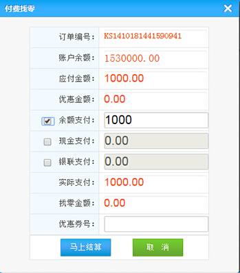 點擊結(jié)算按鈕將彈出付費找零界面,點擊馬上結(jié)算可完成消費: