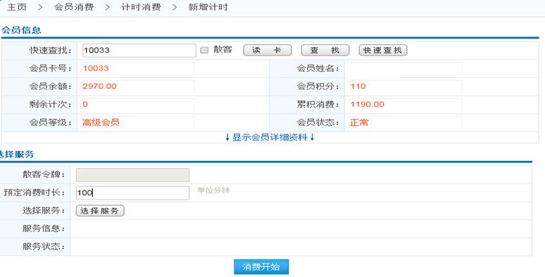 在文本框中輸入會員卡號,可查詢該會員的計時消費記錄