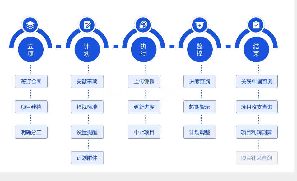系統(tǒng)中支持查詢:項(xiàng)目進(jìn)度(含關(guān)聯(lián)單據(jù))、項(xiàng)目資金收支情況、項(xiàng)目利潤測(cè)算情況、項(xiàng)目損益表(財(cái))。